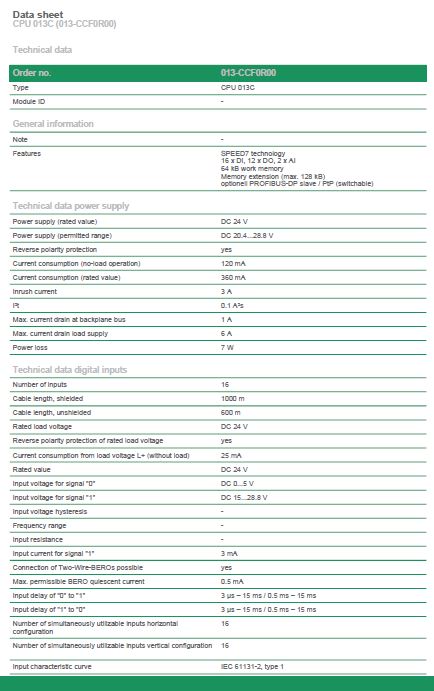 Part Number: VIPA 013-CCF0R00 Description: CPU 013c - SPEED7 Technology Power supply: DC 24V Onboard I/O, 16DI, 12DQ, 2 x AI (4 x 100kHz, 2 x PWM up to 20kHz) Working memory integrated: 64kByte (50% program / 50% data) Working memory expandable up to: 128kByte (50% program / 50% data) Interface 1: RJ45: TCP/IP PG/OP-communication (Switch) Interface 2: RJ45: TCP/IP PG/OP-communication (Switch) Interface 3: RS485 (isolated): MPI, USS-Master, ASCII, ETX/STX, 3964R, Modbus-Master /-Slave (switchable), optional Profibus Slave SD card slot with locking mechanism Expandable up to 64 SLIO modules pluggable Programmable via SPEED7 Studio, SIMATIC Manager and TIA Portal