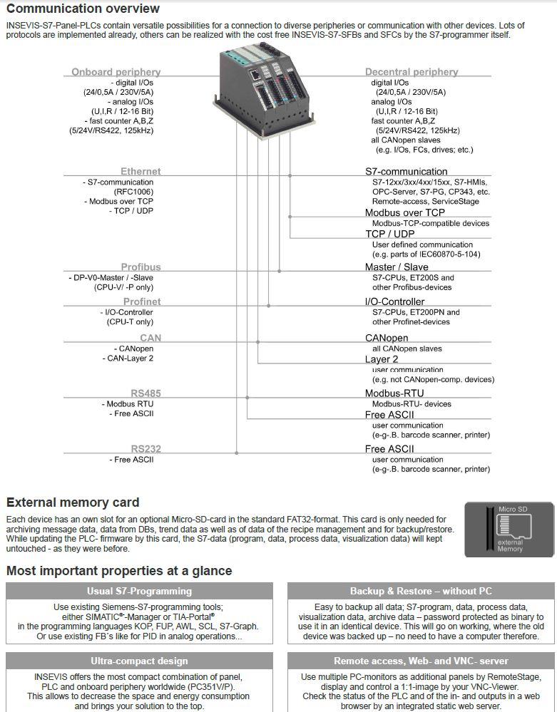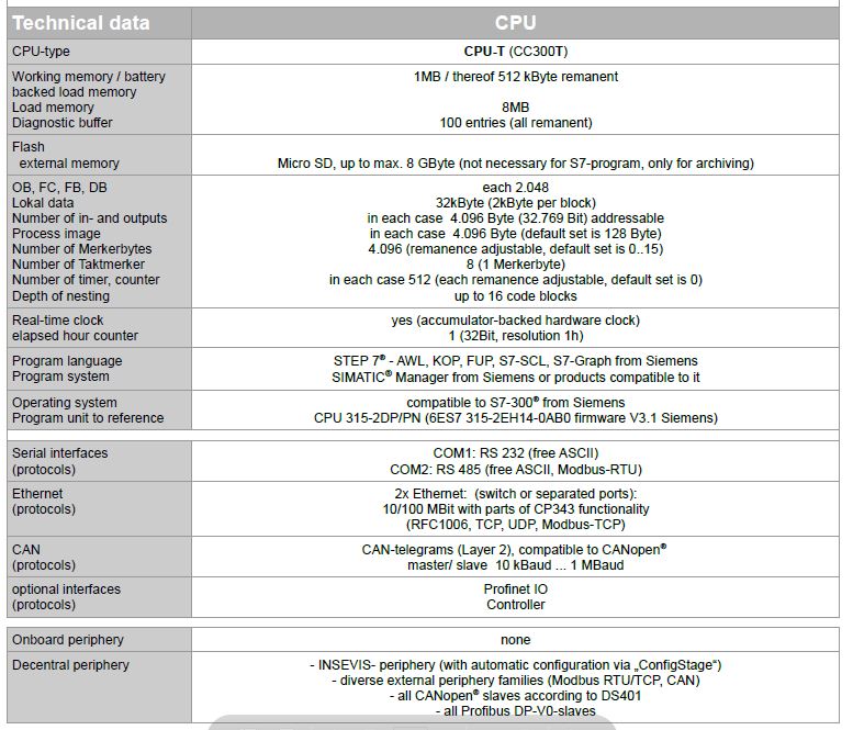 Part Number: CC311T-PNC-02 Description: CPU 311T ProfiNet Programmed by STEP7 or TIA Portal from Siemens or WinPLC7 from VIPA as a Siemens 315-2PNDP DC 24V 1MByte work memory, 8MByte load memory, 48MByte visual HMI memory 10 slots available for I/O modules SDCard slot, real time clock, 4096byte I/O address area 512 timers (IEC timers unlimited) 512 Counters (IEC Counters unlimited) 2 x Ethernet interfaces, each separate or switch like CP343-1 from Siemens, PG, HMI, S7 Functions, Send/Receive, Modbus TCP 2 x ProfiNet interfaces. PtP interface RS485 and RS232, ASCII, STX/ETX, 3964R, Modbus RTU CANopen, CAN-Layer2 Supplied with Spring Terminal Front Connector (Search Tags) S7300, S7-300, 300V, 6es7315-2ah14, 315-2pndp Resource Download Manual http://www.automationwarehouse.com.au/ manuals/insevis/Manual_CompactPLC.pdf First Steps with STEP7 from Siemens http://www.automationwarehouse.com.au/ manuals/insevis/First_Steps.pdf First Steps with WinPLC7 http://www.automationwarehouse.com.au/ manuals/insevis/First_Steps_WinPLC7.pdf How to set the IP address from factory STEP7 http://www.automationwarehouse.com.au/ manuals/insevis/Set_IP_Address_STEP7.mp4 How to set the IP address from factory TIA Portal V14 http://www.automationwarehouse.com.au/ manuals/insevis/Set_IP_Address_TIA_V14.mp4 Alternative to Siemens: 6ES7 315-2EH14 (Search Tags) S7300, S7-300, 300V,