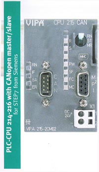 Part Number: VIPA 216-2CM02 Description: CPU 216, with CANOpen Master interface 192kByte Memory, Intern. Flash EPROM MMC-Slot. Clock 192K Load Memory No MMC required Datablocks - 2047 Function Blocks - 1024 Function Charts - 1024 Scan Time Bit - 0.18micro sec S7 Counters - 256 S7 Timers - 256 IEC Timers - Yes Flags - 8192 bits I/O address - 1kByte / 1kByte Process image - 128 Bytes Modules per line - 32 Modules total (local) - 32 MPI Port Programmable with STEP®7 from Siemens and WinCoCT CANOpen configurator from VIPA