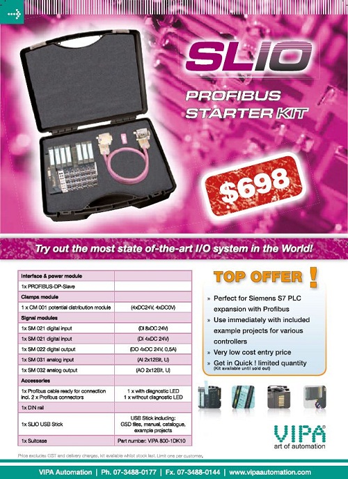 Part Number: VIPA 800-1DK10 Description: SLIO Starter kit, perfect for Siemens S7 PLC exapnsion with Profibus. Use immediately with included example projects for various controllers. Very low cost entry price Get in Quick ! Limited Quanity and available only until stock sold out SLIO Starter kit including the following items: 1 x Profibus DP Slave IM053 1 x CM001 distribution module 1 x SM021 DIx8 24VDC 1 x SM021 DIx4 24VDC 1 x SM022 DOx4 24VDC 0.5Amp 1 x SM031 AIx2 12bit V 1 x SM032 AOx2 12Bit V 1 x VIPA 972-0DP01 Profibus connector 1 x VIPA 972-0DP10 Profibus connector 1 x Short Profibus cable pre-fitted to the connectors 1 x DIN Rail 1 x SLIO USB Stick, including GSD files, Manual, Catalogue, example projects 1 x suitcase